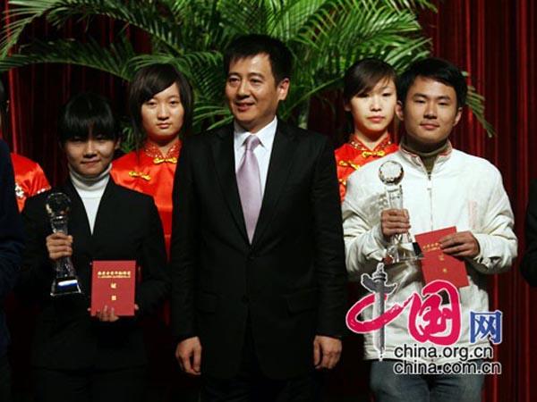 中国人民大学外国语学院院长何其莘为获奖者颁奖