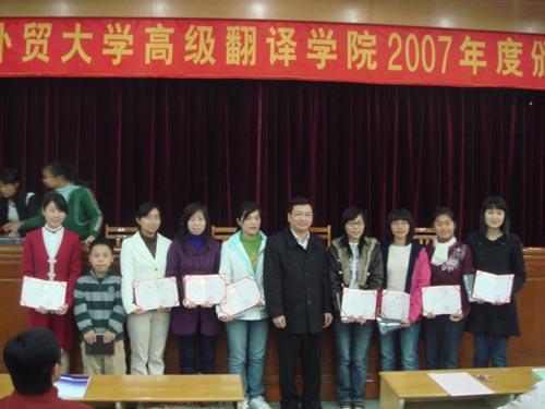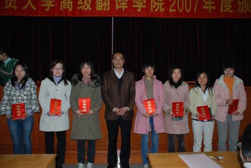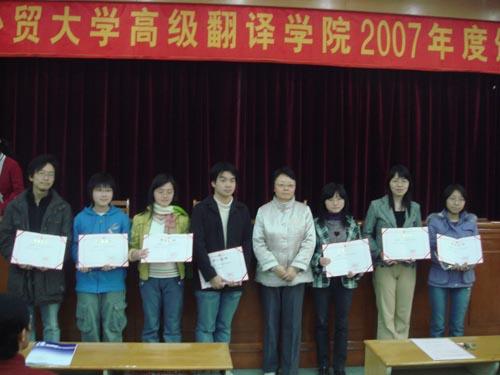 2008年1月4日下午3点40分,高级翻译学院在行政楼第一会议室举行了2007年度颁奖大会。大会由院长助理詹成主持,穆雷院长、梁学宏书记、余东副院长和MTI中心主任赵军峰教授出席了大会并给获奖学生进行颁奖。