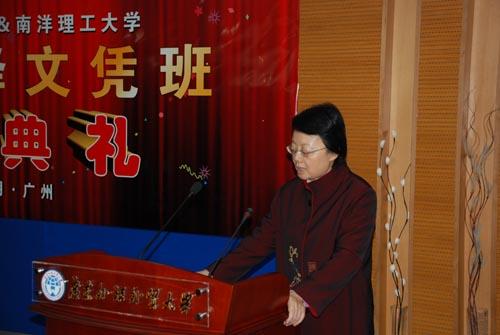 首先,穆雷院长代表高级翻译学院向圆满完成学业的15名学员表示了热烈的祝贺。穆院长在讲话中提到为了办好第二届高级翻译文凭班,实现合作交流的目的,高级翻译学院排派出了强有力的师资力量,设置了我校“国家级精品课程”英语口译课程系列,给与各方面的全力支持,力图在首届高级翻译文凭班的基础上,让同学们获得更高水平、更丰富多彩、更加难忘的经历和收获!穆雷院长以两句话作为离别赠言:译无止境,学无止境!文化交流,共建未来!并勉励他们将学习作为一生的追求,奉献一个完美的自己,去实现自己的理想,同时希望他们回国之后,能够带回我们对贵国的友好祝福,一起努力促进双方的文化交流,共建中新两国的美好未来。